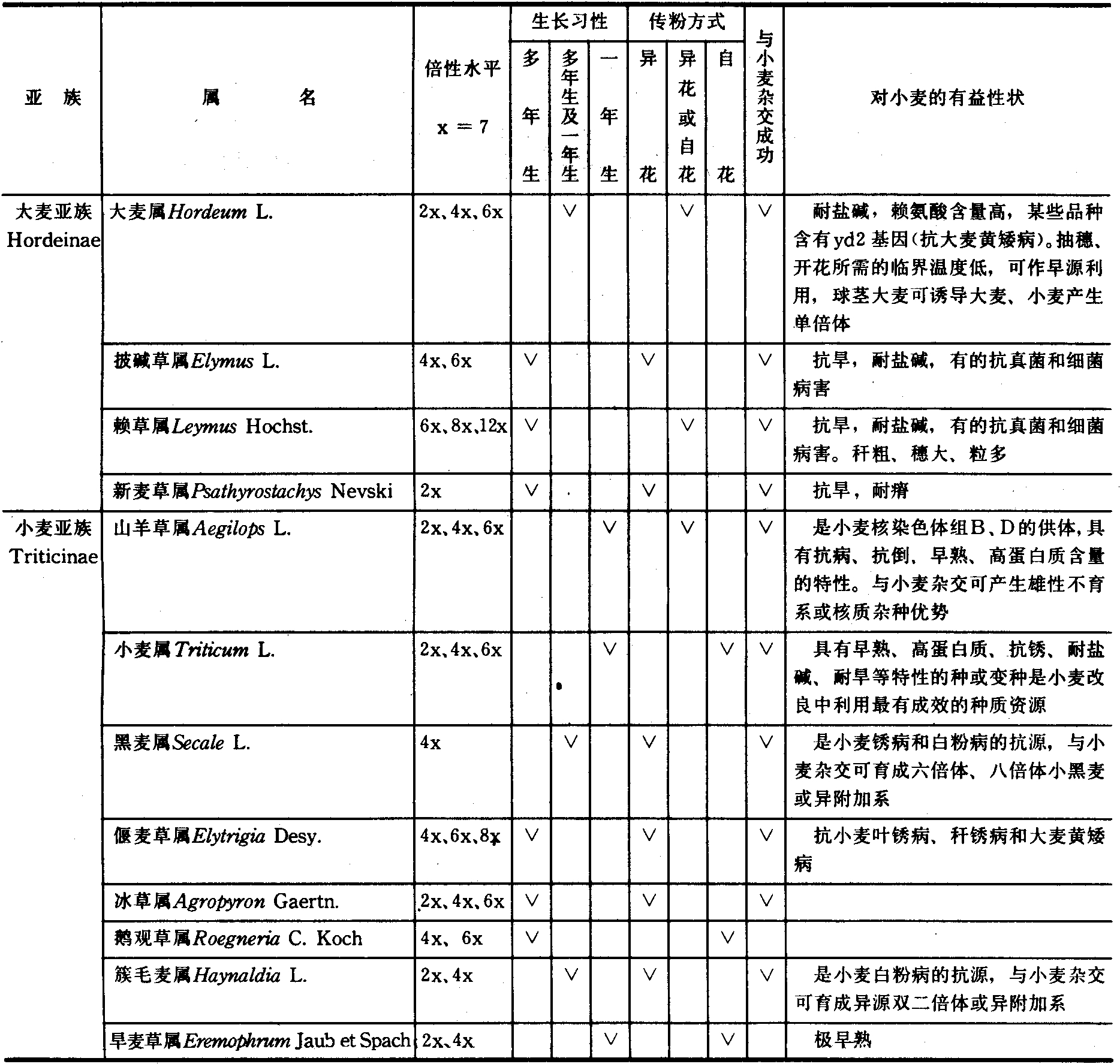 与小麦有较近亲缘关系的小麦族内各属植物。族内物种为穗状花序,染色体组的基数(x)都是7,不同染色体组之间的部分同源染色体都有可能互换,因而可以把这些植物的有益核基因或细胞质基因导入到小麦的细胞核或细胞质中,为小麦品种改良扩大基因库。已知可与小麦杂交成功的亲缘植物有山羊草属、黑麦属、偃麦草属、披碱草属、簇毛麦属、赖草属、大麦属、旱麦草属和棱轴草属等(见表)。