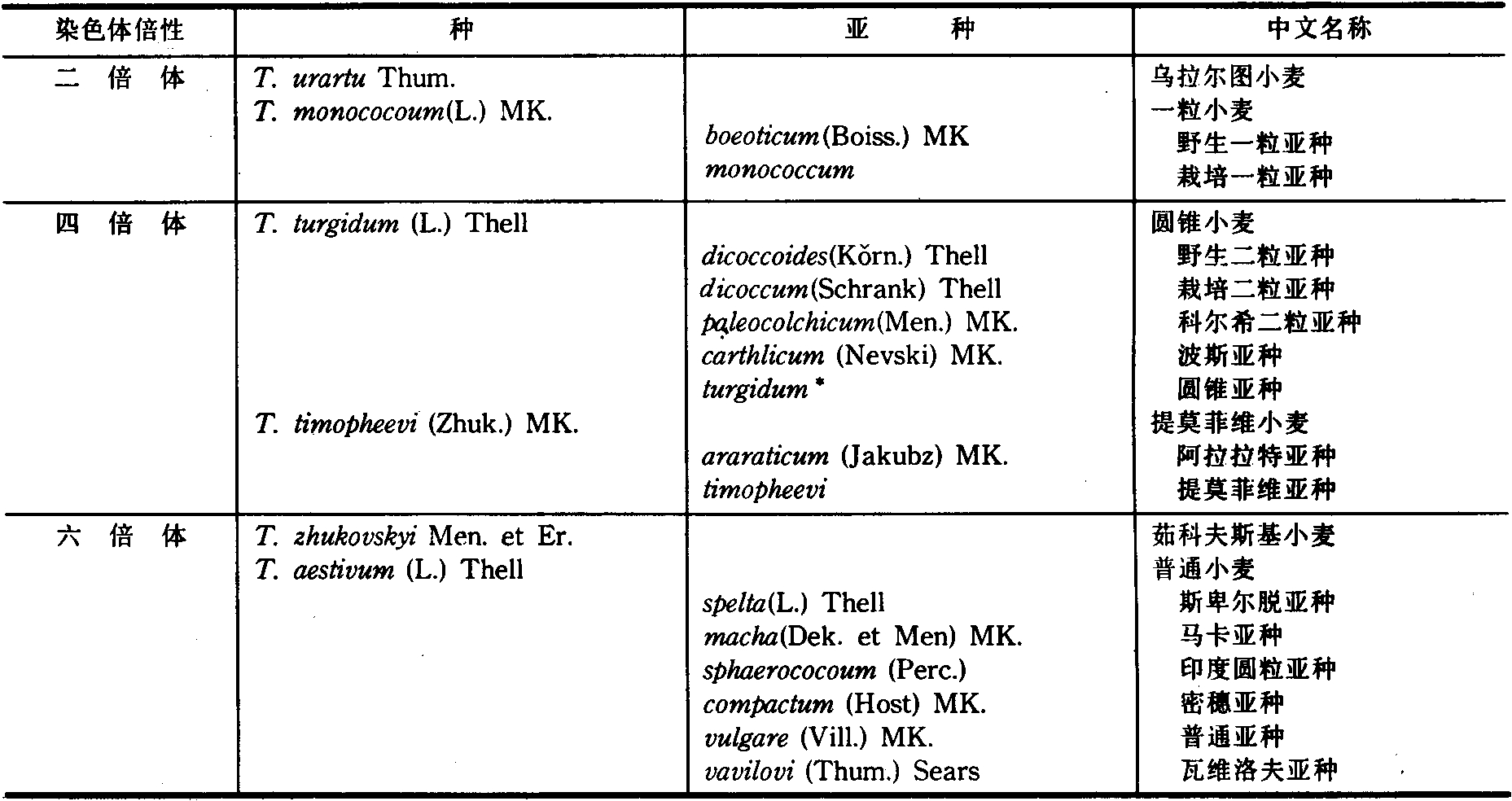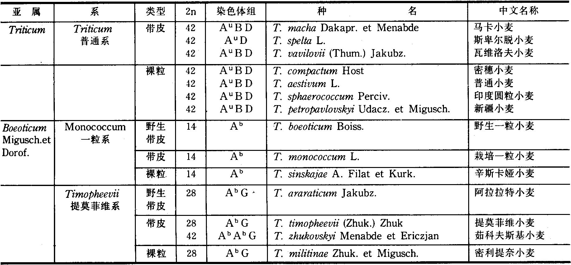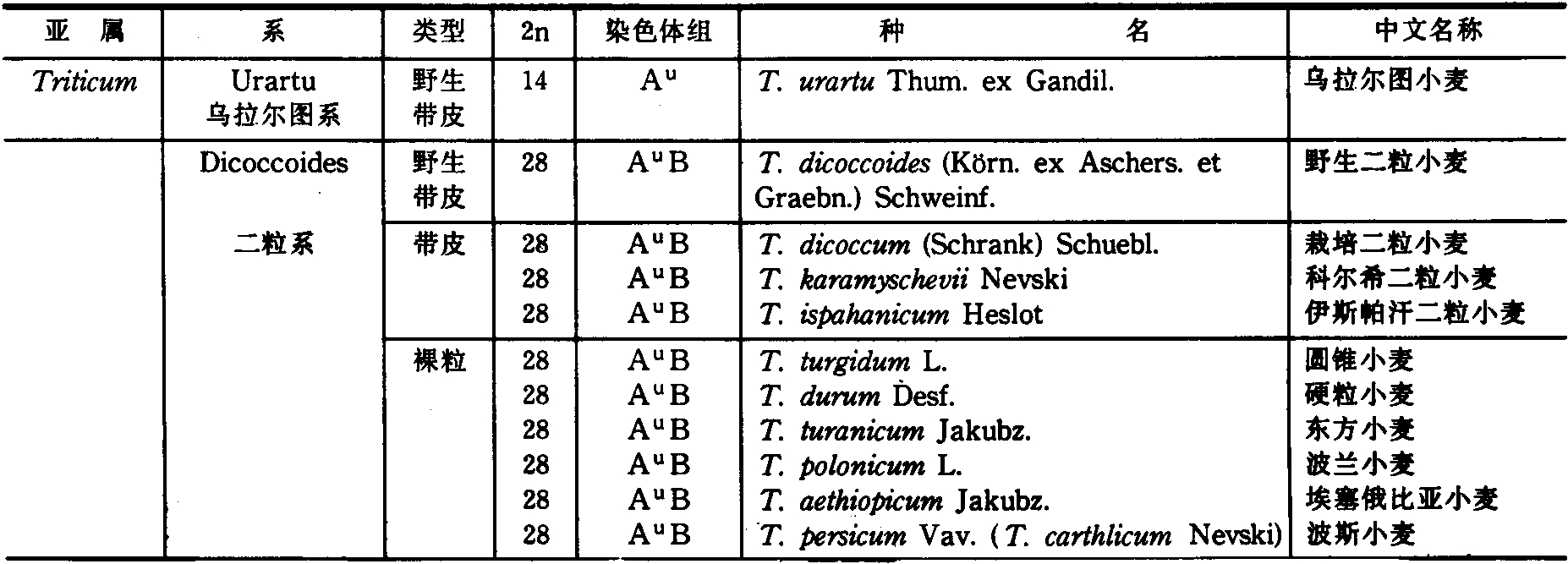 表1 麦基的小麦属分类系统