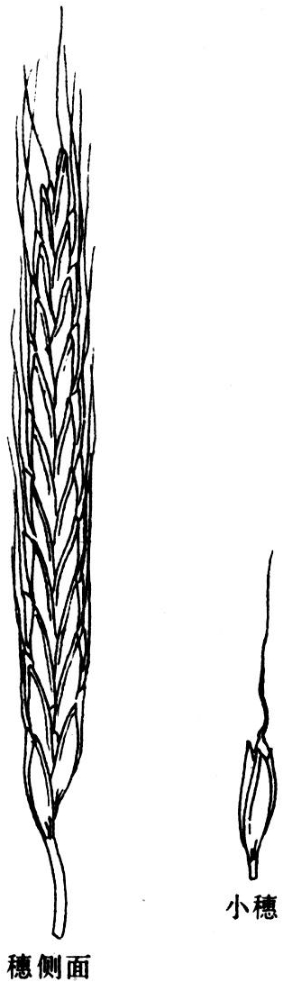 幼苗直立,分蘖较少。叶片具稀长茸毛,株高90~100厘米,茎较细,茎节有短毛。穗纺锤形,长9~10厘米,侧面宽于正面,小穗20~22个,每小穗2~3花,结实2粒,小穗基部无茸毛。护颖白色,颖脊明显,颖嘴钝,颖无肩或只有一小侧齿,内颖较外颖短1/4至1/3。穗轴较细易断,折断方式为上节位。种子带皮(稃),难脱粒。粒长、红色、硬质。春性,种子休眠期短,收获前易在穗上发芽。籽粒蛋白质含量较高。抗叶锈病、秆锈病和散黑穗病,感染条锈病和白粉病。