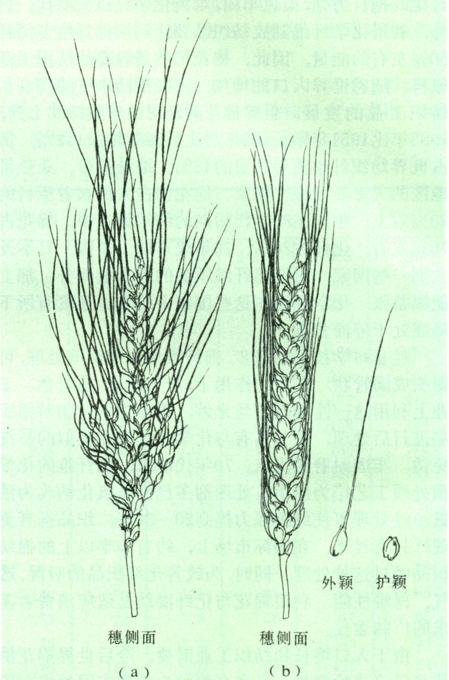 冬性、弱冬性或春性。穗大、多花、多实,每小穗5~7花,结实3~5粒,芒粗硬,长度超过穗子,芒色有黑、白两种,穗茎节间上部为髓质所填充。穗型有分枝、不分枝两种(见图)。不分枝者与硬粒小麦相似,不同点是护颖和外颖较硬粒小麦的短小,且护颖长度仅为外颖的2/3左右,芒一般较硬粒小麦稍细而短:籽粒也较短小,拱形背靠近胚部。颖脊明显,侧脉清晰,穗轴节片基部有浓密的茸毛,穗轴坚韧不易折断。分枝型籽粒较小,不分枝型籽粒较大,因背部隆起故呈卵圆形或近圆形,顶端呈截断状,皮厚,软质或半硬质。粒色有白、红两种,籽粒蛋白质含量一般在12%左右。叶片、茎秆和穗部均具蜡质,抽穗前后呈蓝绿色。多数生育期长,表现中熟或晚熟。中国有部分早熟材料,越冬性较差,喜湿、不耐旱,宜在水肥充足的条件下种植。有些品种具良好的抗病性和丰产性。中国用分枝圆锥小麦与普通小麦杂交育成科遗23、科遗26等品种,表现耐瘠、耐盐碱的特点。苏联用圆锥小麦与二粒小麦杂交,再与硬粒小麦复交育成了哈尔科夫46(Харьсовская46),曾是世界种植最广的硬粒小麦品种。(孙雨珍)