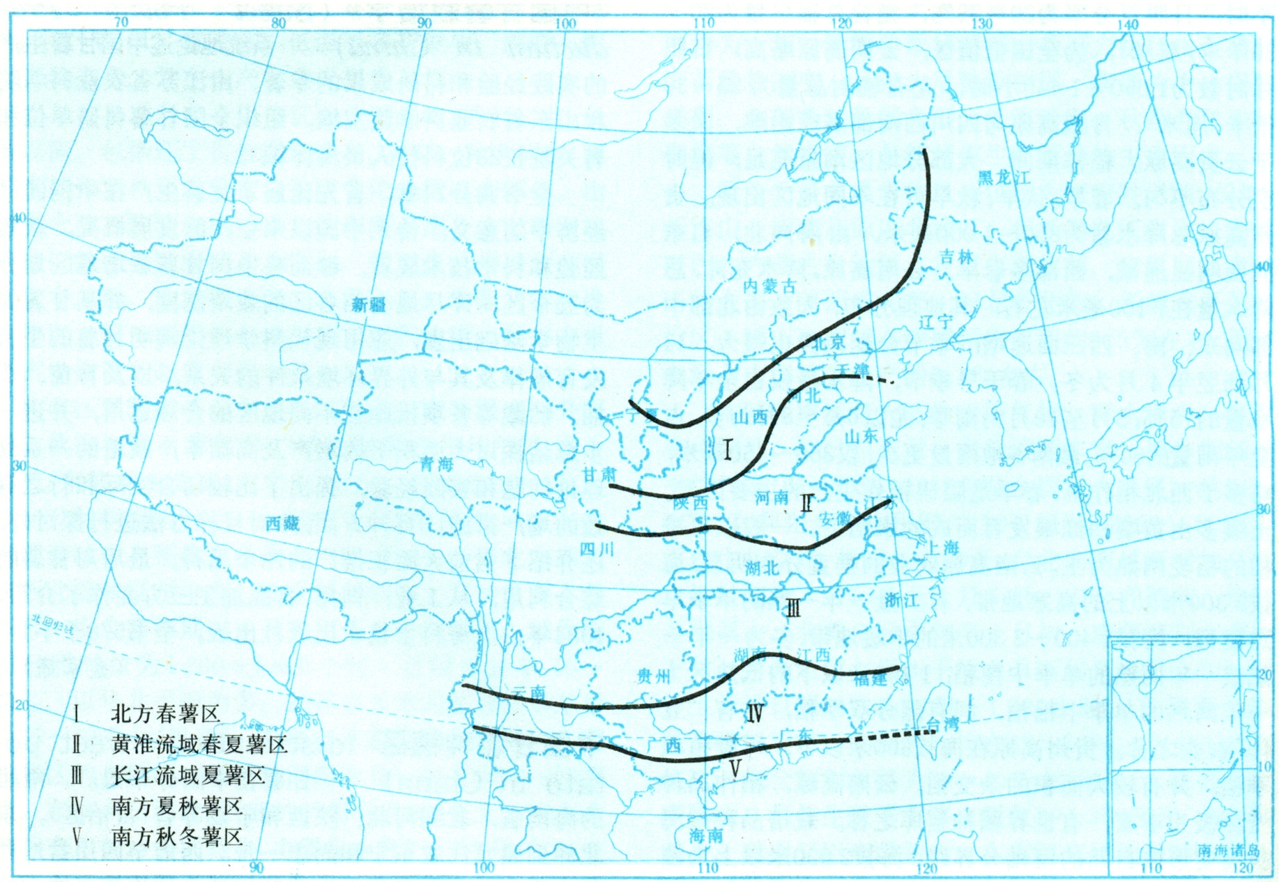 为斜跨东北、华北和西北边缘的一条狭长地带。北线西起宁夏回族自治区,向东穿过陕西省榆林,入山西省和河北省北部,经承德伸向东北地区,至黑龙江省齐齐哈尔以南一带;南线西起武都沿秦岭北麓经保定市、天津市到旅大市。本区属季风温带和寒温带,湿润和半湿润气候。除黑龙江省外,全年无霜期为150~210天,年平均气温8~13℃,生育期气温在16℃以上,6月至8月在20℃以上,生育期气温日较差10~15℃左右。全年总辐射量106~134千卡/厘米2,年日照时数2000~2900小时,日照百分率45~66%。年降水量450~750毫米。栽培制度为一年一熟制以春薯为主,生育期130~140天,栽后60~70天有效薯数已基本稳定,100天左右茎叶生长达到高峰,随后薯块迅速膨大。此时北方日照足、温差大,产量较高而稳定。