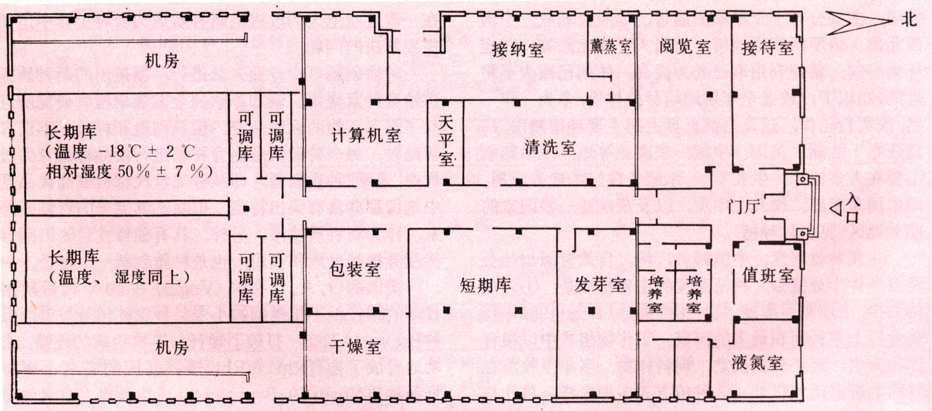种质库一般由库房、机器房和清选室、熏蒸室、发芽室、干燥室、资料档案和计算机室等组成。库房是整个建筑物的核心。