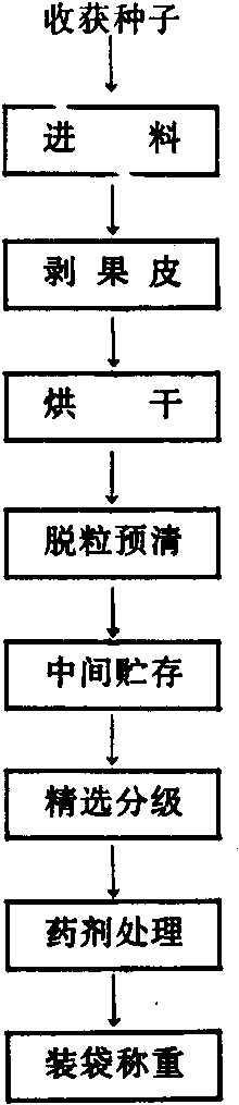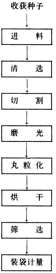 种子机械加工是以流水作业的程序进行的。包括初选、脱芒、去石、烘干、精选、分级、药剂处理、丸衣、包装、计量等工序。①初选。对种子进行初步清选,除去大杂质和灰尘。②脱芒。脱去种子外壳上的芒或毛刺,使种子表面光滑,便于进行清选、加工。③去石。除去混入种子中的石砾。④烘干。进行加热干燥处理,使种子含水量降低到符合袋装或罐装贮存的要求。烘干设备因作物和地区而异,可采用烘干箱、烘干仓或烘干室。烘干时,要控制烘干温度,以保证种子发芽力不受影响。⑤精选。除去种子中的小杂质、破碎粒等。⑥分级。一般按种子大小进行分级,使各级种子大小整齐一致。⑦药剂处理。用粉剂和液剂拌种,使种子表面附着一层杀虫、杀菌农药,以防治病虫害。⑧丸衣化。用各种杀菌剂、杀虫剂、除草剂、种肥、生长剂或其他药剂与粘着剂、干燥剂配成的丸衣剂给种子包衣,使之形成外表光滑的丸粒,便于机械播种。播种后药肥缓慢释放,可防治病虫,并促进生长。⑨切割和磨光。甜菜种是多胚的,外形不规则,需用切割机分割成人工单胚种子,再用磨光机磨去部分外壳,然后进行丸衣化工序。⑩包装计量。装袋、称重、贴标签,便于入库、运输和销售。