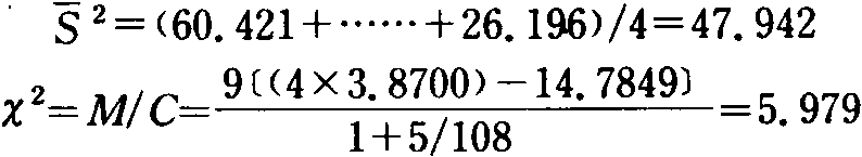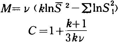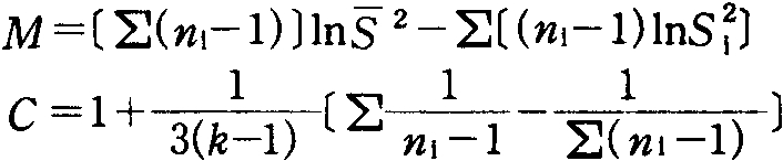 测验多个方差是否同质。M.S.巴雷特(Bartlett)1937年提出自由度皆为ν=n-1的k个方差()的M/C值大致遵从自由度为k-1的X2分布。其中: