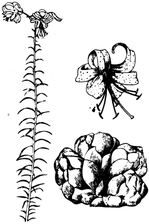卷丹百合(L.lancifolium Thunb.) 鳞茎扁圆形,高3.5厘米,直径4~8厘米,鳞片宽卵形,长2.5~3厘米,宽1.4~2.5厘米,白色微黄,略有苦味。叶条形,叶腋着生珠芽,花被橙红色反卷,有紫黑色斑点。中国华中、华北、东北、西北、西南及青藏高原海拔400~2500米处均有野生种或栽培种。太湖流域主栽品种为宜兴百合。