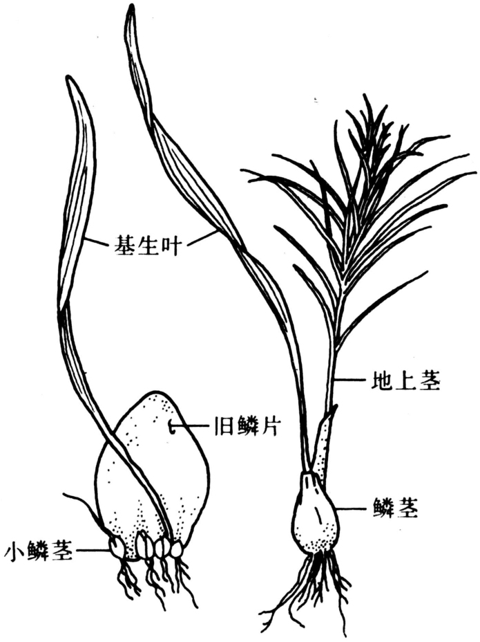 鳞茎由披针形肉质鳞片抱合而成,着生在鳞茎盘上,顶芽在鳞茎的中心。顶芽出土后,其旁侧常形成2~6个新发芽点,翌年或三年后各自分离成独立的鳞茎。鳞茎大小因种类而异,小者100克以下,大者200~300克。鳞茎有肉质须根及纤维根,着生于鳞茎盘底部的为肉质须根,分布于地下40~50厘米处,寿命2~3年;着生于地下茎部分的为纤维根,分布在表层土壤中,吸收矿质营养及支持茎的直立。茎抽生的不定根,当年秋后与茎同枯。地上茎直立、不分枝,绿或紫褐色。有的种叶腋着生紫褐色“球芽”,有的种地下茎节着生白色“小鳞茎”,球芽及小鳞茎均可作繁殖材料,需5~6年培养成为食用鳞茎。叶披针形、全缘、绿色、平行脉、无叶柄,散生或少数轮生。花单生或排列成总状花序,具苞片,花有喇叭形、钟形,花被反卷或开张不反卷;雄蕊6枚,花药丁字形着生,雌蕊3心皮,子房上位,3室;蒴果内含种子约240粒,种子扁平有翅,千粒重3.4克。