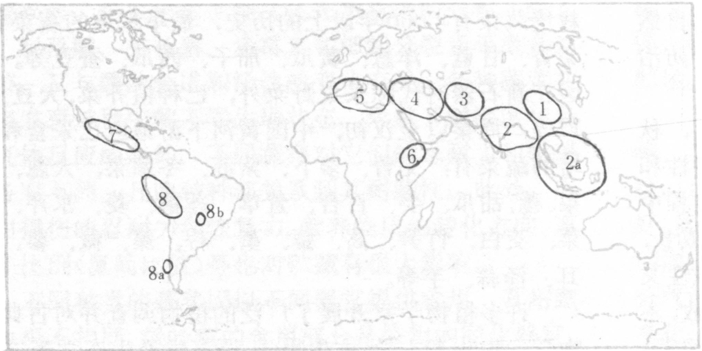 按照瓦维洛夫的原著,认为世界的栽培植物有8个起源中心,其中第2及第8中心又分别分出一两个中心,总计为11个中心(见图:图中1为中国中心;2为印度-缅甸中心;2a为印度-马来亚中心;3为中亚细亚中心;4为近东中心,5为地中海中心;6为阿比西尼亚中心;7为中美中心;8为南美中心;8a为智利中心;8b为巴西-巴拉圭中心)。后来达林顿又加了一个北美中心。各中心起源的蔬菜(其中有一部分蔬菜起源取自近代一些学者,如苏联茹科夫斯基、英国伯基尔等的有关起源学说和以后的研究结果已证明是中国原产的种类)如下: