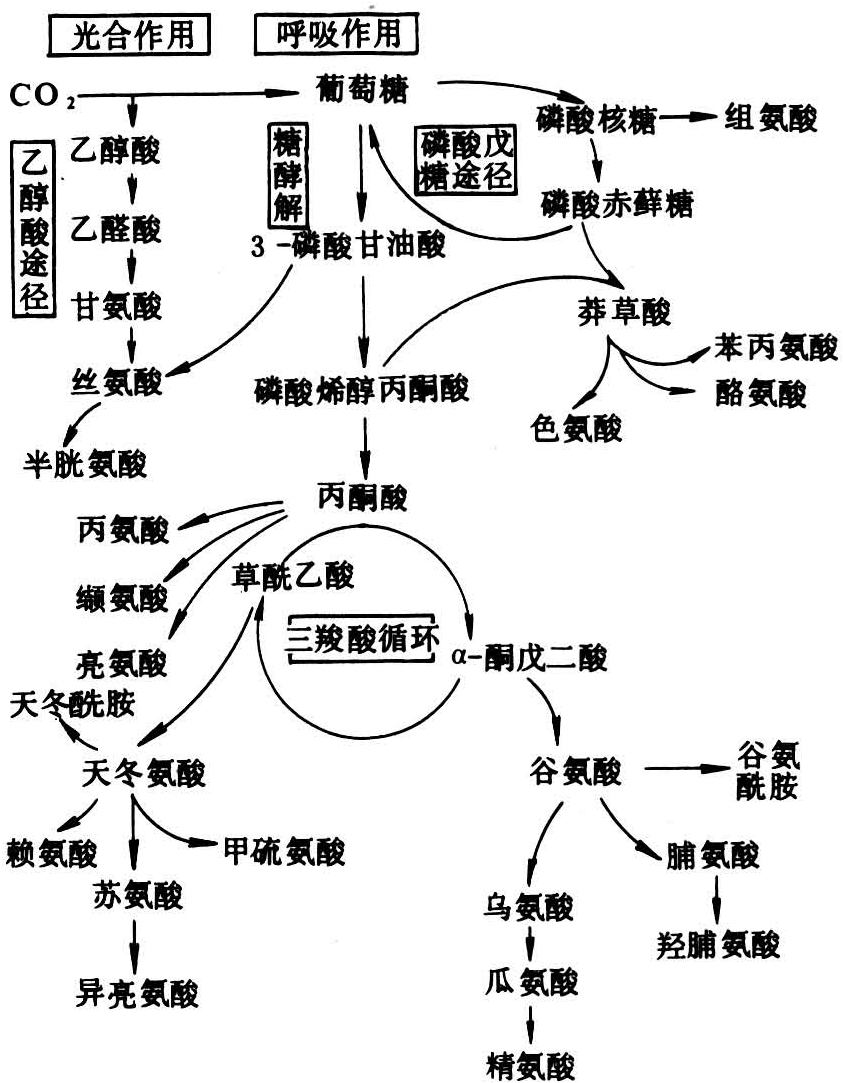 氨基酸的合成(转化)途径有下列几种(见图):①由α-酮酸经还原性氨基化作用而成。即由α-酮酸与NH3作用,生成亚氨基酸,然后亚氨基酸被还原而形成氨基酸,如α-酮戊二酸在L-谷氨酸脱氢酶的作用下转变为谷氨酸的反应。L-谷氨酸脱氢酶的辅酶在动物体内是烟酰胺腺嘌呤二核苷酸(NAD+)或烟酰胺腺嘌呤二核苷酸磷酸(NADP+),在植物体内则为NADP+。上述反应不仅是合成谷氨酸的途径,也是合成其它氨基酸的途径之一,因为谷氨酸的氨基可转到任何一种α-酮酸上。②由谷氨酰胺合成谷氨酸。反应过程是由谷氨酰胺合成酶和谷氨酸合成酶催化的,两种酶对底物的亲和力较强,反应所需底物浓度较低,反应速率也较快,被认为是植物体内无机氮素转化为氨基酸的主要途径(见氨同化作用)。③由α-酮酸经转氨基作用而产生。即α-氨基酸的氨基可以在转氨酶的作用下,转移到α-酮酸上,从而形成一分子α-酮酸和一分子α-氨基酸。转氨酶的种类很多,但其辅酶则均为磷酸吡哆醛,它能接受氨基酸分子中的氨基而变成磷酸吡哆胺,氨基酸则变成α-酮酸;然后,磷酸吡哆胺再将其氨基转移给另一分子α-酮酸,生成新的氨基酸。生物体内氨基酸的转氨作用极其普遍,在20种氨基酸中,只有极少数氨基酸(苏氨酸和赖氨酸),其氨基不是从转氨作用得到的。④氨基酸之间转化。一种氨基酸,在某种情况下可以转变成另一种氨基酸。例如丝氨酸可生成甘氨酸,苯丙氨酸可转化为酪氨酸,蛋氨酸可转化为半胱氨酸,胱氨酸与半胱氨酸可以互变。