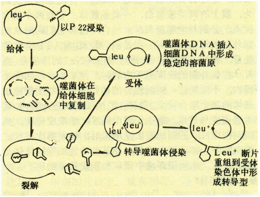 1951年津德(N.D.Zinder)和莱德伯格(J.Le-derderg)首先在鼠伤寒沙门氏菌(Salmonella typhi-murium)发现转导现象。他们将甲硫氨酸和组氨酸营养缺陷型菌株LT-2与苯丙氨酸、色氨酸和酪氨酸营养缺陷型菌株LT-22分别接种在戴氏U形管的两臂内,中间用超微多孔的硼硅酸玻璃滤片隔开,以防止两种细菌直接接触。结果在LT-22一端获得了能在基本培养基上生长的野生型重组体。它不是由细菌接合产生的,而是由一种过滤因子导致的。这种过滤因子用DNA酶处理不被水解,所以不是DNA分子,排除了转化的可能性。这种过滤因子的大小和质量与P22相同,用抗P22血清处理后失活,故证实是P22。至今已在大肠杆菌、肺炎克氏杆菌(Kiebsiella pneumoniae)、痢疾志贺氏菌(Shigella dysenteriae)、葡萄球菌、枯草杆菌、假单胞菌和变形杆菌(Proteus)等20多种细菌发现有转导现象。在放线菌和高等动物的细胞株中也有报道。