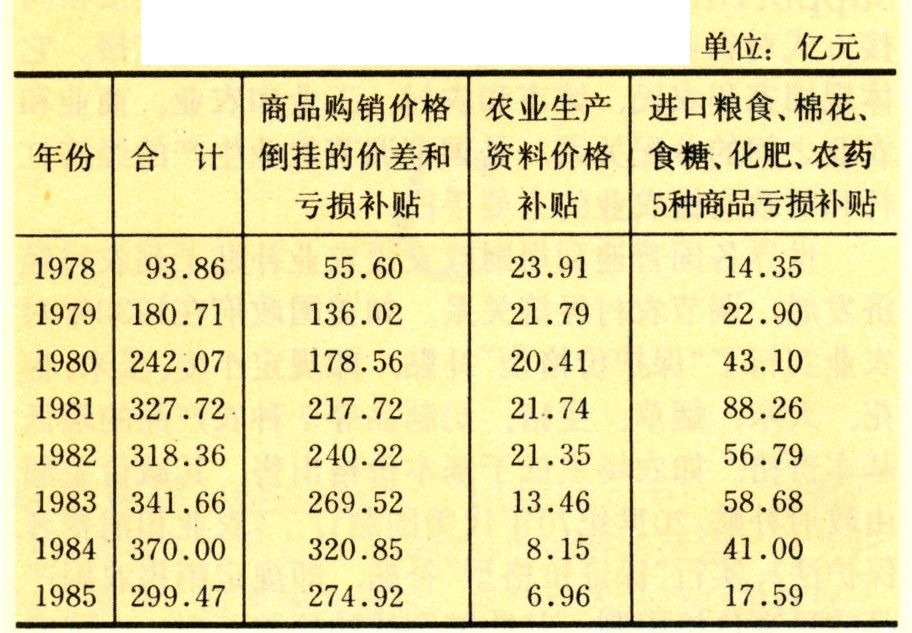 价格补贴占财政收入比重,1978年为8.4%,1985年上升为16.0%。仅1979~1985年财政负担的价格补贴累计达2173.85亿元。