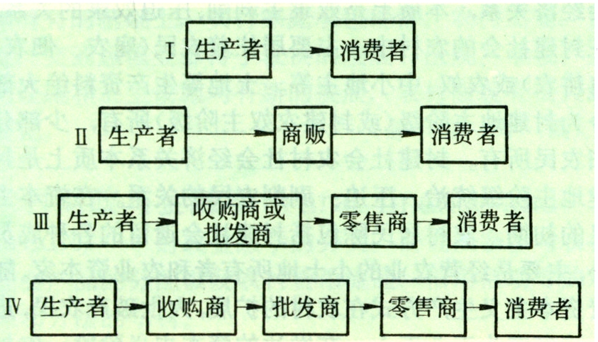 此外,不同种类的农产品可以有相同的销售渠道,也可以有不同的销售渠道。一种农产品可以通过若干不同途径,从生产者手里到达消费者手里;另一种农产品,只需要单一或少数的途径,从生产者手里到达消费者手里。一种农产品可以全部或一部分是直接运销;另一部分是间接运销。一种农产品可以少环节流通:另一种农产品则需要多环节流通。这都是由农产品商品运动的内在特点决定的(图2)。
