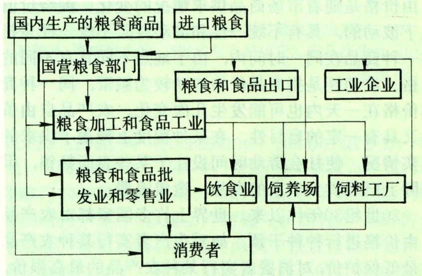 中国商品粮食主要是由国营粮食部门收购和进口,再由它批发和零售给加工企业、消费单位和消费者个人。但是加工工业,食品工业,饲料工业以及粮食批发、零售业,也分别直接从粮食生产者那里购买粮食。粮食生产者也将自己的产品直接或通过小商贩销售给消费者。所以,粮食销售是多渠道的,主要是间接销售,也有一部分直接销售。