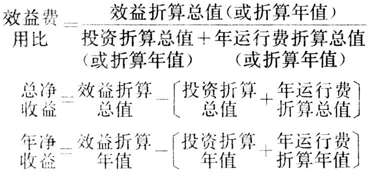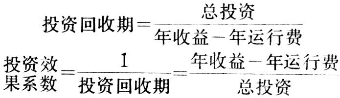 不考虑“资金”的时间价值,只用原值进行计算,也是一种有用的方法。一般采用投资回收期和投资效果系数等指标,评价工程方案的经济合理性。投资回收期是指用每年的净效益(此处指无税收工程的年利润)偿还工程投资所需的年数,其倒数称为“投资效果系数”。如果年收益和年运行费各年不同,一般用逐年平衡进行计算;年收益和年运行费各年均等时,用下式计算: