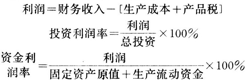 有些微观经济效果指标如效益费用比、投资回收年限等,其表达式与宏观经济效果指标相似,但效果计算内容是不同的。例如税收,在企业是一种支出,要从净效益中扣除。农田水利工程设施所得的财务收入减去生产成本和产品税之后的余额即为该工程项目的利润;利润与总投资的比值称为“投资利润率”;利润与固定资产原值和生产流动资金之和称为“资金利润率”。公式如下: