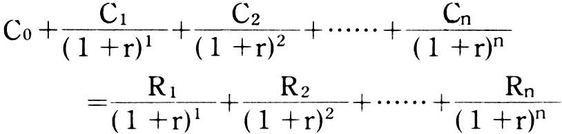 式中 C1、C2、……Cn分别是第一年,第二年,……第n年当年的费用额;C0是第一年开始时(即第0年)的费用额;R1、R2、……Rn分别是第一年至第n年的当年产值额;r是未知的年利率,即所求的内部报酬率。