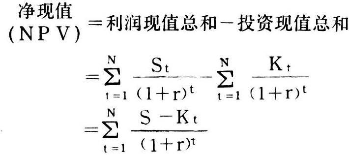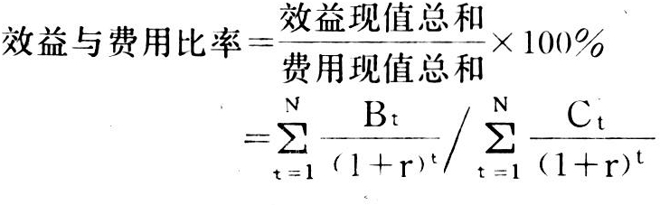式中 St为第t年的利润,Kt为第t年的投资;N为项目经济寿命年限;r为利率(标准利率或银行利率)。②效益与费用比率。即效益现值总和与费用现值总和之比。如果其比率大于1,说明投资项目的效益大于费用,是可取的;如果其比率小于1,则这个项目会带来损失,应予否定。其算式: