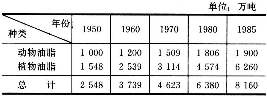 表1 1950~1985年世界动植物油脂生产发展状况