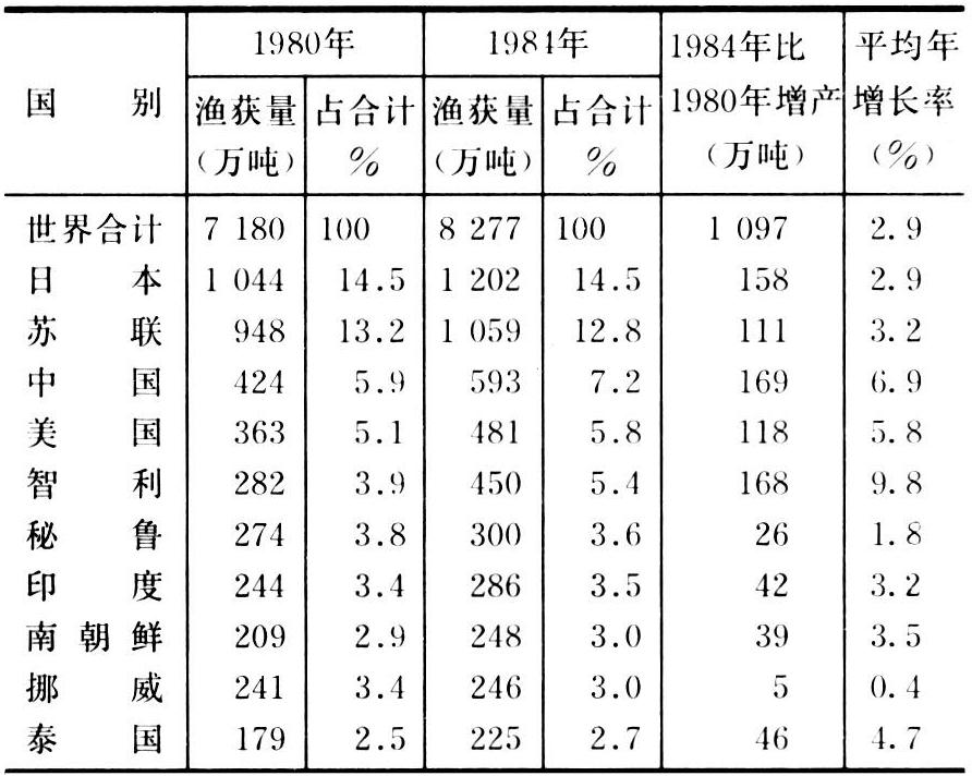世界主要水产国和地区有日本、苏联、中国、美国、智利、印度、秘鲁、南朝鲜、挪威和泰国等。1984年 世界渔获量比 1938年约增长2.6倍。1980~1984 年,世界渔获量年平均增长率为2.9%,各主要水产国中增长最快的是智利和中国,其次是美国和泰国(见表1)。