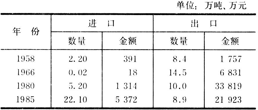 中国水产品出口品种主要有:塘鱼、冻鱼、对虾、鳗鱼、海蜇、贝类、紫菜和水产品罐头等。主要输往日本、美国、东南亚、东欧和香港、澳门等60多个国家和地区。水产品进口品种主要有朝鲜的明太鱼,日本、东南亚的海味品和秘鲁的鱼粉等。中国水产品进出口数量见表2。