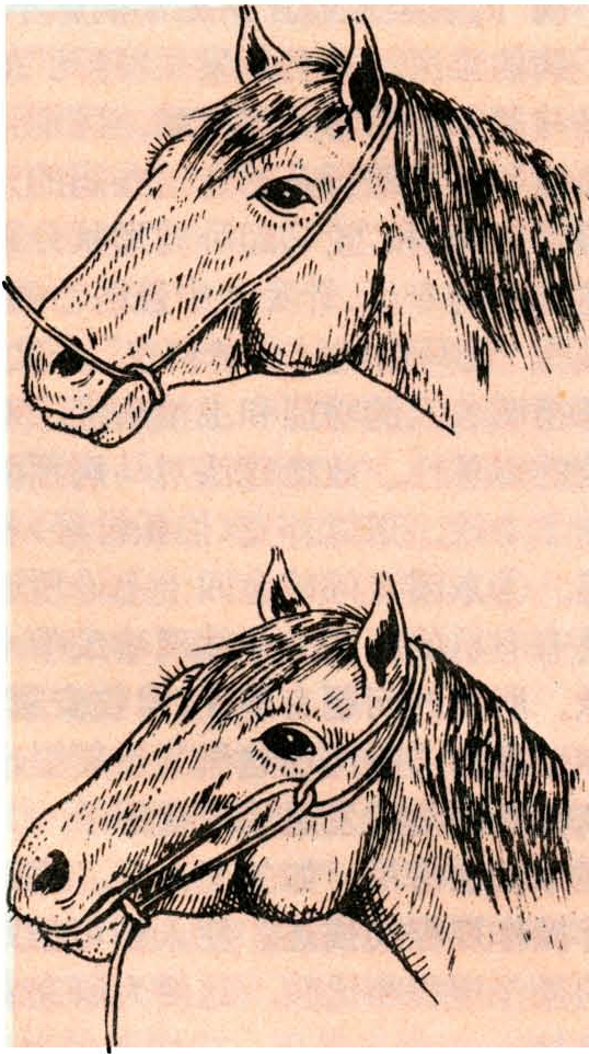 口勒一般为1.5厘米左右粗的铁棒,其长度与马的口裂相适应,两端各打成一个圆环,分别扣以铁链,与笼头两侧的金属环扣接。保定时将口勒套入马口内,勒紧缰绳便可使其得以控制。另一种方法是绳圈套于下颌后,将游离部折成绳绊,使绳绊越过耳后项部,弯曲部安放在对侧的耳下方。然后使游离端经切齿齿龈,折弯向后上方,穿过绳绊的弯曲部;再向下穿过套在下颌上的绳圈。最后调整各段绳的松紧度,以便稍微牵拉绳的游离端,使马产生适当的压迫感(图2)。