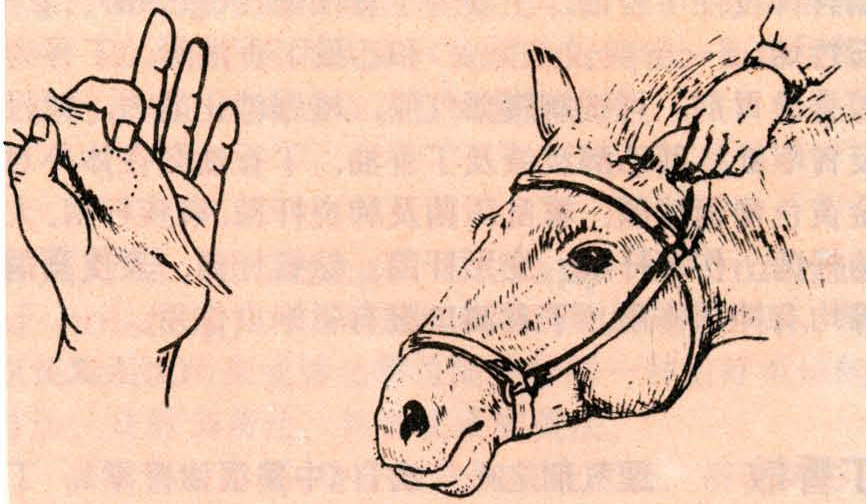保定人员站在马颈侧,用一手的拇、食指按于耳根部,其余三指按于耳壳上,用力将耳朵抓住,并使劲拧紧,患畜即可安静。或者用核桃大小的石头一块,先塞入耳壳内,再用力拧握,保定更加牢固(图3)。猪亦可使用此法保定。