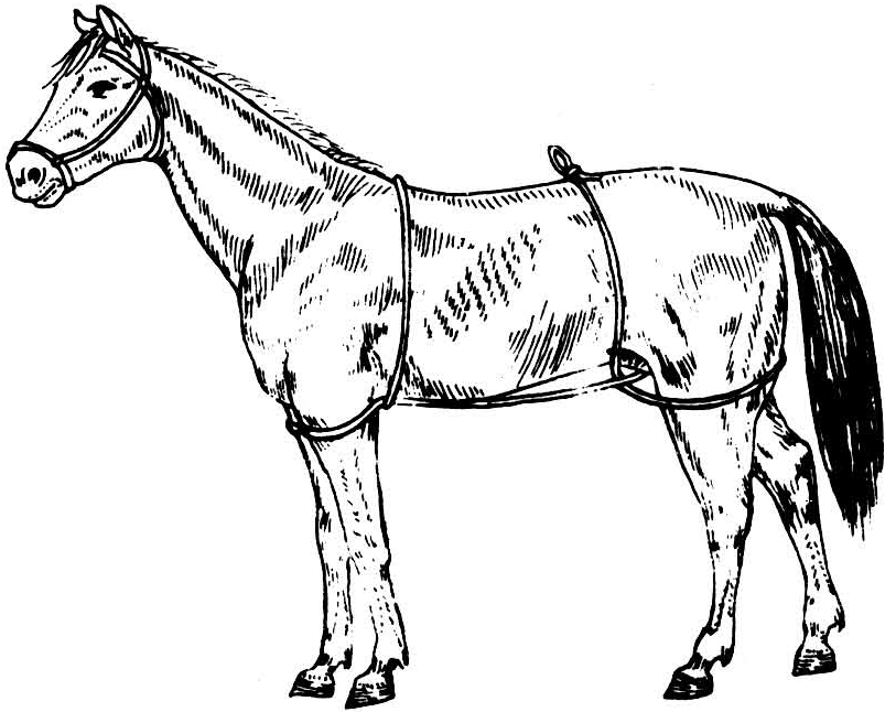 用一根较长的保定绳对折,中点置于鬐甲部,游离端分别沿两侧胸壁向下,经肘突后向内、前方,穿过两前肢之间,再分别向外,各绕前臂向后,再穿过肘后胸壁绳的内侧,继续向后引,经两后肢之间,各向外绕后肢一圈,又从腹下绳穿过,直到腰荐部。将绳全部收紧,使绳紧贴于身,然后打结固定(图9)。此法既能防马前扒,又能防后踢。