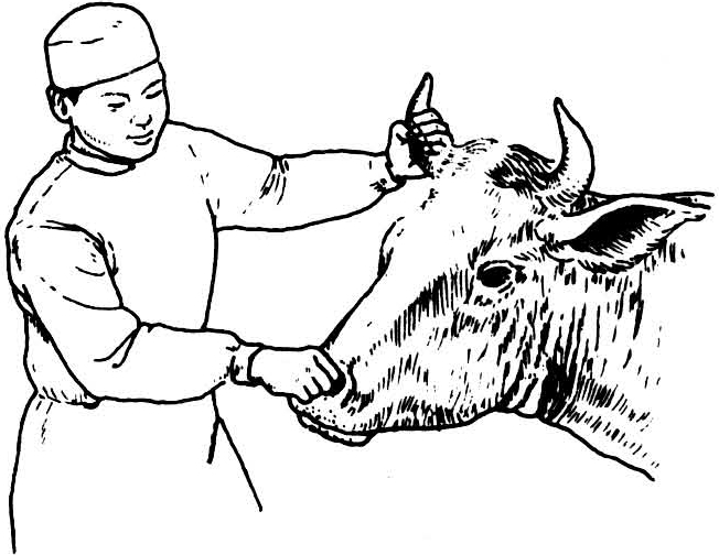 用长约1.5米的木棍一根。保定者一手抓住牛鼻环,一手将木棍的一端穿过鼻环直抵两角之间,并以此作支点,利用杠杆作用,握住木棍的另一端往上抬,将牛头的前部抬举到适当高度,即可施术或灌药。如牛无鼻环,可用麻绳一根,一端系于牛角根部,另一端交扭成圈套于牛嘴部,如笼头一样。亦可穿入木棍抬举保定。