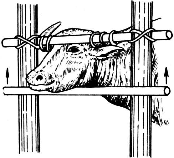 先设置两根立柱(或利用相距1~2米的两棵树),在两根立柱之间系一横杠(高低根据牛体大小而定)。先将两角缚在横杠上,使牛头不能左右摆动。另用一根略小的木杠,横系在牛下颌处,两端由助手固定,或固定于立柱,牛头即被充分固定(图13)。此法仅适用于有角牛。