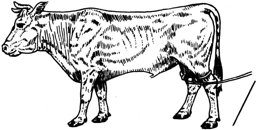 用长约3米的保定绳一根,绳的一端结一小绳圈,经牛背送至对侧,又从腹下拉回。将绳的另一端穿过小绳圈。再将保定绳围绕牛体,形成一个大绳圈,再将大绳圈向后推移,由臀部滑到飞节上部,迅速拉紧绳头,两后肢即被固定不能侧弹,腰胯的诊治便可顺利进行(图14)。