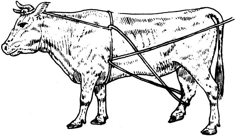 用长约10米的保定绳一根,一端以活结固定在颈基部侧面,游离部分向后引至胸部时,绕胸背一周,于肩后交扭,再向后引到腹部,绕腰腹一周,于肷窝处交扭。然后将两绳圈逐个抽紧,一人牵缰绳向前拉牛,2~3人向后用力拉紧绳头,牛即倒卧。倒卧后,继续拉紧后躯的保定绳。牛则不能站起(图16)。