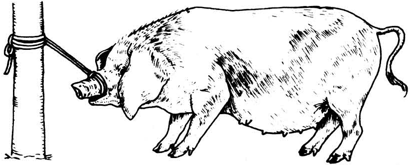 用一根长约2米稍硬韧的细绳,一端打滑结形成一个活绳套。将猪赶至栏角(或由助手将猪捉住),保定者迅速将活绳套套入猪的上颌犬齿后方,立即拉紧绳套,拴在柱栏上。猪感勒痛往后退,越退越痛,猪便安静(图20)。松解时,将鼻梁上的活结拉开即可。