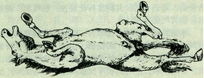 眠。有劳医人袖上觅,摘却之时必见安。”马包皮形似衣袖之口,故《元亨疗马集》有“蜱虫咬袖”之称。多因马匹拴系于有蜱虫不洁之处,或在污秽不洁草地上放牧,遭受蜱虫侵袭所致。饥饿时蜱虫形似蜘蛛,吸血后则体形变大。雌大雄小,相差悬殊。雌虫在畜体吸饱血后,落地产卵,在适当的温度、湿度下发育成为幼虫,多见于春夏两季,蜕化变为成虫则多见于夏秋两季。幼虫、成虫多寄生在畜体上吸血,故马骡在放牧时即可被侵袭感染。证见在蜱虫咬刺时,患畜刺痛如蜂锥,故突然倒地,起卧不安,四足朝天(图),眼望阴部,疼痛难忍,如遇水渠河流,便急卧水中,或呈犬坐姿势,在地面挫擦包皮。仔细检查阴筒、包皮部,常可找到虫体。待吸血已饱时,疼痛即行停止,因而起立如旧,水草如常,脉平色正。治宜摘除虫体,杀虫药剂清洗被侵袭部位。先将患畜倒卧保定,用手寻找和摘去蜱虫,然后用贯仲散(《元亨疗马集》:贯仲、鹤虱、花椒、臭橘、芜荑、蛇床子)或用贯仲、鹤虱、花椒、大枫子、辛夷、蛇床子(《中兽医治疗学》)煎汤清洗患部。马匹应冬拴暖厩,夏系凉棚,勿在多蜱虫的草地上放牧,勿拴在污秽不洁有虫之处。(王佑之)
