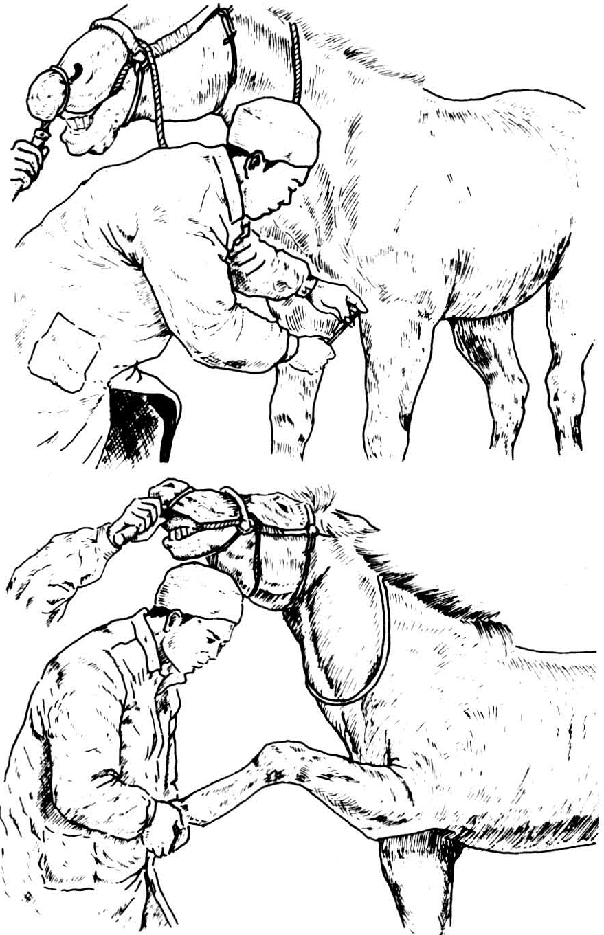 最常用的穴位是弓子穴,用以治疗前臂肌肉萎缩、肩膊痛等。具体方法是将穴位剪毛消毒,用大宽针刺破皮肤后,术者双手配合用力提起穴位周围皮肤,再随即放松皮肤,如此反复,让空气随着皮肤一提一放进入穴位皮下,并用手渐渐挤压进入的空气充塞于病变部位皮下。最后用碘酊棉球按揉消毒针孔。术后注意不要让患畜剧烈运动,防止气体散失影响疗效。若需第二次治疗,须间隔10天以上。