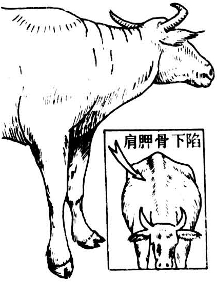 家畜受损伤后立即发病,出现不同程度的前肢跛行,轻症主要为肩关节捩伤或肩胛上神经过度牵拉引起。伤后站立时病肢虚踏于地,伸向前方、后方或稍外展,以减轻负重。与健肢相比,似乎相对变长。健肢常伸在胸下,靠近正中,身体重心偏向健侧,病肢的肩胛骨紧贴于躯干,肩胛骨下降,肩胛软骨低于健侧(图),臂骨的大结节向外突出,显得比正常粗大,肩关节角度变小,前部凹陷增大,用力推压臂骨的大结节,可使该凹陷暂时靠近,肩关节角度增大,但一松手又复原位。触诊肩关节颈部,可感到冈上肌、冈下肌松弛无力。一般疼痛不明显。由打击或跌倒所致的肩关节部挫伤,或肩臂肌肉损伤而引起者,证见肩关节或有关肌肉部位发生肿胀。触诊局部可感到增温,疼痛。将病肢作屈曲、外展、内收和拉伸等他动运动时,有疼痛反应。运步时多呈悬混跛,病肢向内或向外划弧前进,肩胛骨不能随着前肢运动而前后正常摆动,出现明显的云头不翻。严重病症,站立时病肢轻轻接触地面,起卧和运动十分困难,不愿行动,驱赶时呈重度跛行,病肢抬不高、迈不远甚至三脚跛行,跛行随运动而加重。转为慢性时,肩胛部肌肉萎缩,长期跛行。