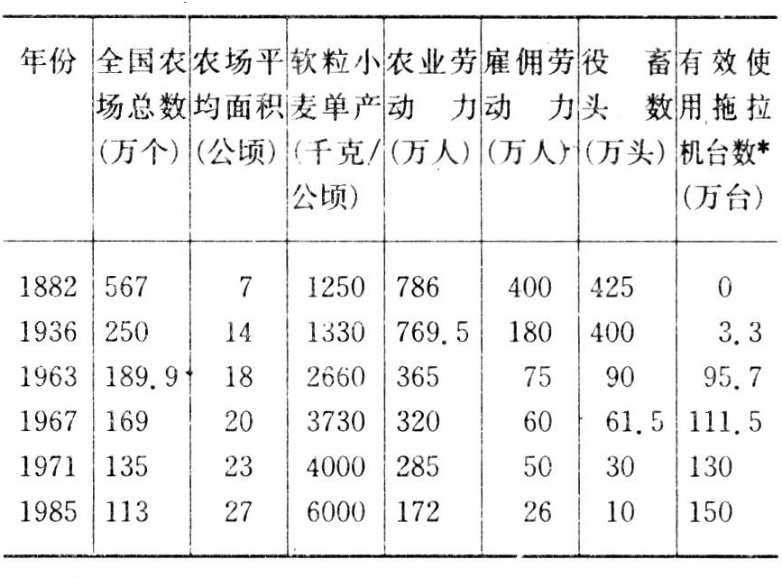 1955年全国有231万个农场,1985年减少到113万个。其中规模在20公顷以上的48.5万个农场占有全部农用土地面积的80%。