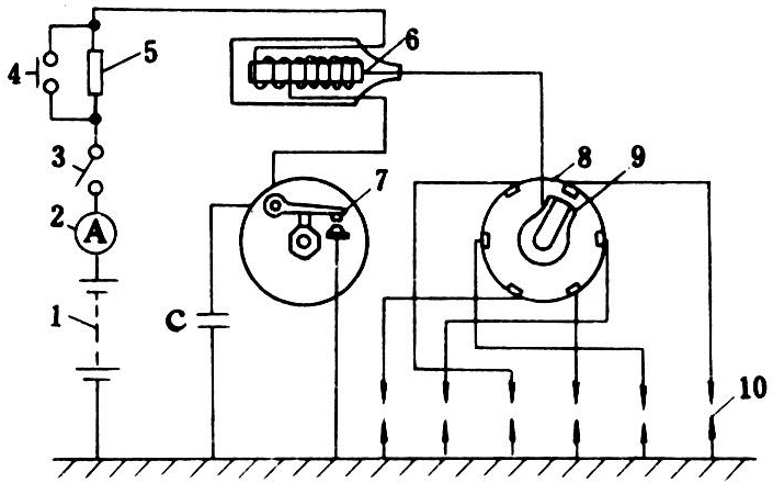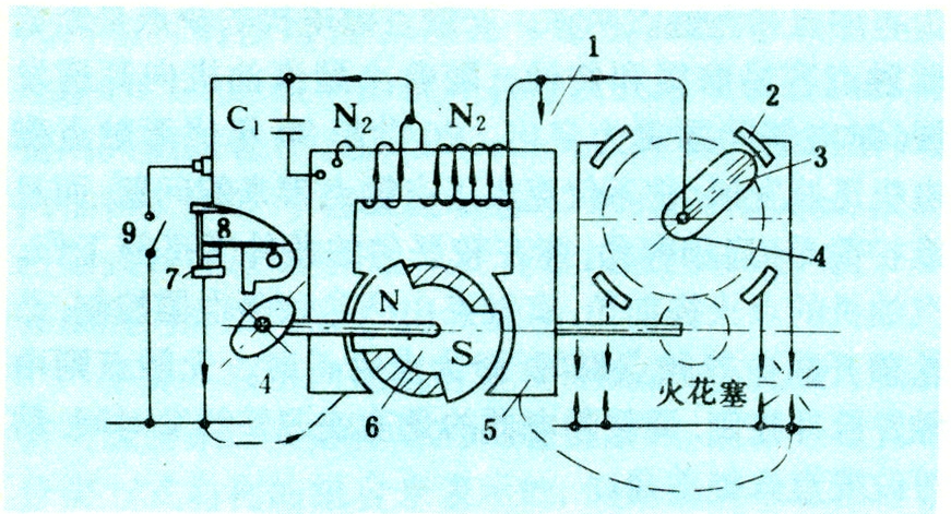主要由电源(蓄电池和发电机)、点火线圈、断电器、分电器和火花塞等组成,图1为工作原理示意图。蓄电池供低压电流给点火线圈初级绕组,靠断电器触点使初级电流骤然断开,在点火线圈次级绕组产生高压电,通过分电器按发火次序在各缸火花塞上点火。为避免触点损伤,高速汽油机及大型煤气机上大都采用电子开关器断电。