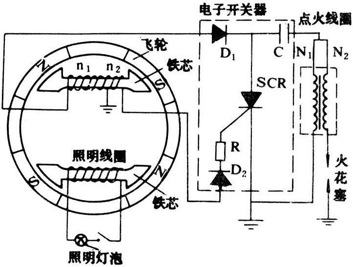 典型结构和原理如图3所示。主要特点是由电子开关器代替断电器。工作时,飞轮带着磁极旋转,充电线圈n1产生感应电动势,经二极管D1向电容C充电;当需要点火时,由触发线圈n2送出一个脉冲电压,经二极管D2、电阻R触发可控硅SCR,使可控硅导通,这时电容C中储存的电能经可控硅向点火线圈初级绕组N1迅速放电,并在次级绕组N2中产生高压,经导线送往火花塞形成电火花。