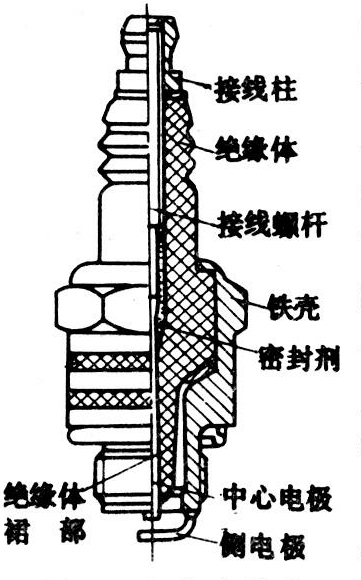 将点火线圈产生的高压电引入汽油机燃烧室内,在电极间形成电火花,以点燃混合气的装置。标准型火花塞结构如图4。它在高电压、高温度、高机械负荷及燃烧产物的强烈腐蚀等恶劣条件下工作,其绝缘体需有足够的绝缘强度,下部应经得起过热或突然冷却的热冲击,主要零部件应有足够的机械强度,整体保持良好的密封性,电极必须耐热和耐腐蚀。