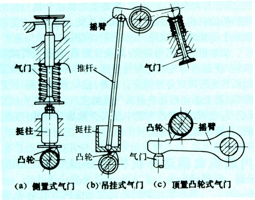 配气机构类型如图2。柴油机常用吊挂式气门的配气机构,它一般由凸轮轴、挺柱、推杆、摇臂、摇臂座、气门和弹簧等组成。汽油机也有用侧置式气门的。顶置凸轮式气门一般用于大型高速柴油机。气门开闭完全受凸轮控制,凸轮型面设计要考虑适宜的配气相位、足够的气门开启时间截面、一定的气门落座速度、允许的正负加速度大小以及曲线的光滑性等。气门弹簧用来使气门在关闭时与气门座紧贴密闭,并保证气门开闭按凸轮型面曲线工作。为避免弹簧共振,变螺距弹簧的应用日渐增多。气门座一般为合金铸铁做的镶圈。排气门材料为耐热合金钢,进气门材料为普通合金钢。由于配气机构与气缸体在热膨胀上的差异,在气门顶端留有0.2~0.3毫米的气门间隙。进气门一般在上止点前2°~16°(曲轴转角)开,在下止点后25°~45°关;排气门在下止点前25°~45°开,上止点后2°~16°关。为了确保配气相位,驱动凸轮轴的齿轮应与曲轴齿轮定位啮合。若采用链传动或齿形带传动,也必须准确定时。