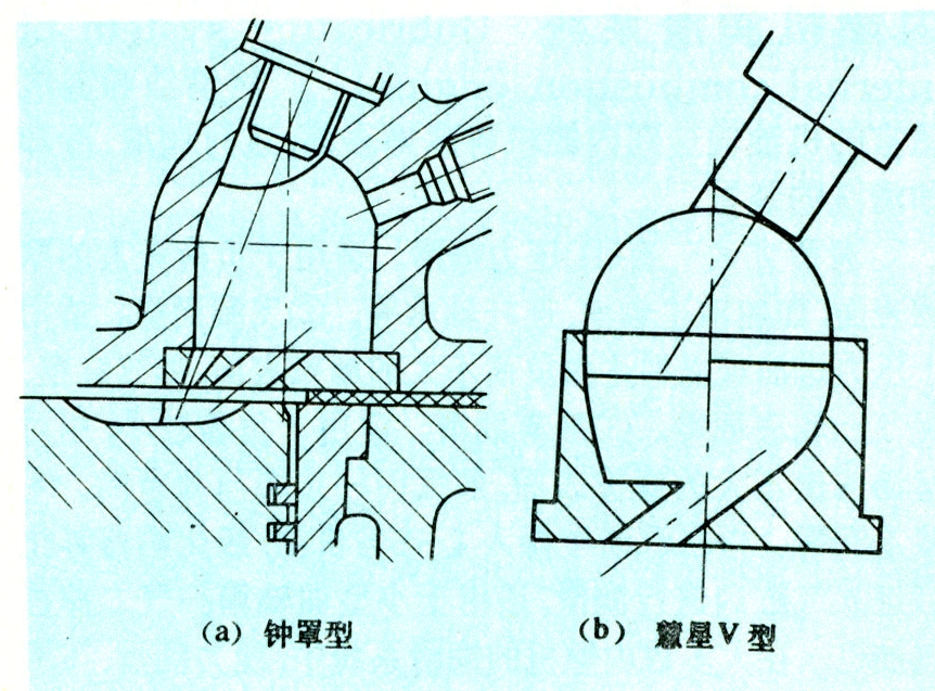 燃烧室分成辅燃室和主燃室两部分,以通道相连。在辅燃室中,利用活塞压缩形成的强烈空气涡流与适宜方向的喷油来实现油、气的混合及燃烧,所形成的高温高压燃气及部分未燃燃油经通道喷至活塞顶上的主燃室内进行二次燃烧。辅燃室按作用方式的不同又分涡流室、空气室、预燃室三种。中国农用柴油机应用较多的是涡流室,典型的有钟罩型[图2(a)]及彗星V型[图2(b)]。辅燃室布置在气缸盖内,周围有冷却水,表面散热损失大,且有狭细通道的节流损失,致使油耗偏高,起动性能较差。因此,多缸发动机常装有电热塞帮助起动。分隔式燃烧室的优点是工作比较柔和,能适应高转速,对供油系统的要求较低,排放污染较少,多用于小型及高速柴油机。