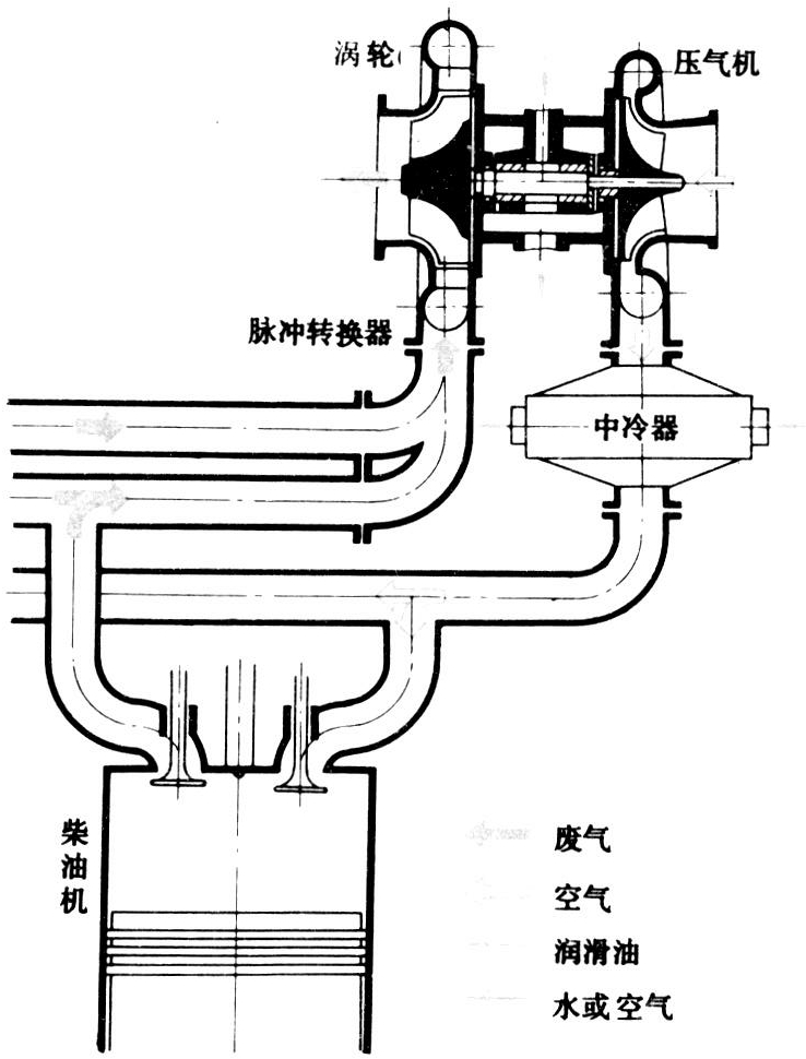 涡轮增压器按涡轮型式分为轴流式和径流式两种。轴流式涡轮增压器多用于大功率柴油机,中、小功率内燃机均采用径流式。涡轮增压器与内燃机的进、排气管相联。从内燃机排气管中排出的高温废气,经涡壳、喷嘴环向心地喷入涡轮叶轮,使其高速旋转,膨胀后的废气排至大气。涡轮带动与它同轴的压气机叶轮旋转,压气机叶轮一般为离心式,它从空气滤清器吸入空气,压缩后通过内燃机的进气管进入气缸(图)。在径流式涡轮增压器中,涡轮叶轮与压气机叶轮分装在轴的两端,组成转子。涡轮叶轮不仅直接受高温废气的冲刷,而且转速高达每分钟数万转至十几万转,故采用耐热钢制造。压气机叶轮材料为铝合金。两种叶轮都是精密铸件,转子必须经过精密动平衡。为了减少轴承与转子轴的相对速度,在其间设有浮动轴套并采用压力油进行润滑、冷却。涡轮和压气机的叶轮背部设有油封与气封以防止油、气互窜。