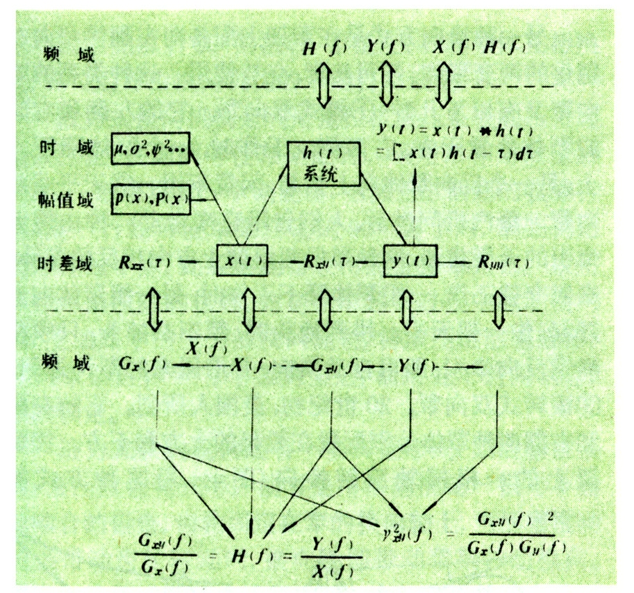 h(t)是在时阈中表示系统的脉冲响应函数,如果物理上可行的稳定系统对应的在频阈中用H(f)来表示系统的频率响应函数。它们之间互为傅里叶变换的关系,图中用符号“”表示。频率响应函数定义为初始条件为零时,作用于系统的输出Y(t)与输入X(t)的傅里叶变换函数之比,它是描述系统传递特性的重要函数。如研究运输机械悬架系统减振效能时,测定前桥与车身间的频率响应函数后就可分析出悬架系统对其振动的衰减性能。