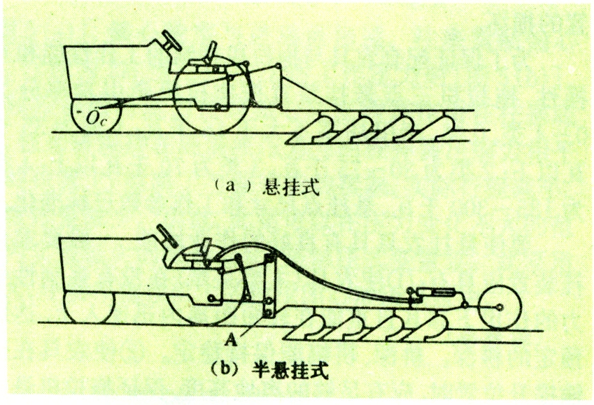 有悬挂式和半悬挂式两种(图1)。悬挂式是指当农具处于运输位置时,农具全部被提升举起,由拖拉机支承。半悬挂式是指农具在运输位置时,其前端由液压悬挂装置提升,后部则通过液压缸推动尾轮把农具的工作部分抬高离地。农具后部的液压缸由拖拉机液压输出装置供油,受驾驶员操纵。