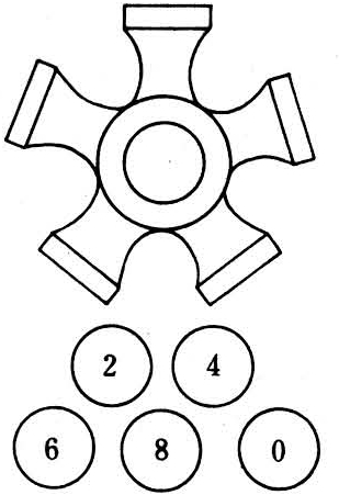 原木和原条经检尺后将长级、径级及等级标志在材身上的作业。有了这种标志则便于对木材的识别、记录及交接验收。有手工打号印和机械打号印两种。手工打号印以钢印为主,也可用蜡笔、毛刷或漏字板。为避免木材经长途运输后号印不清,还可将金属牌钉在木材上。原条、原木的长级一般不用号印,用蜡笔或毛刷以阿拉伯数字标志。径级号印则用印锤,有5个圆面印头,分别铸0,2,4,6,8字样,如图所示。