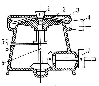 结构如图3。其再碎是通过研磨作用来达到的。主要部件为上下齿盘,刨花和木片在回转的下磨盘和固定的上磨盘之间被研磨。原料从顶部料口落下,经上磨盘圆孔落在下磨盘中心的甩料螺旋上。随着磨盘的回转,刨花和木片被均匀地抛向磨盘四周,被上、下磨盘切碎成狭长刨花,由出料口排出。调节磨盘的间隙,即可调节刨花的最终尺寸范围。