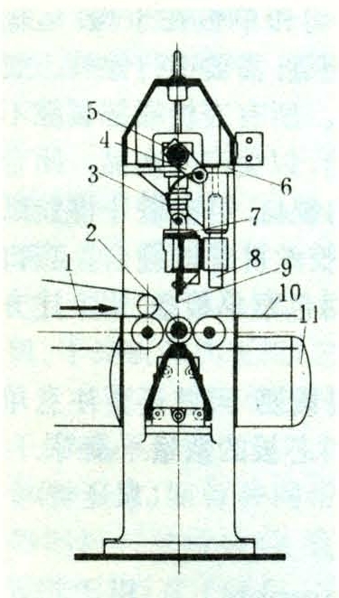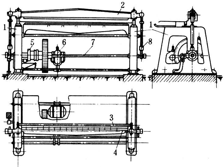 简称气动式剪切机。由机架、气压系统和机械传动3部分构成,图2为其中一典型结构。压缩空气通过电磁阀控制气动摆动马达正、反转,经联轴器与主轴联接,驱动曲柄连杆机构使刀架沿着圆柱导轴作往复运动剪切单板。气动式剪切机以砧辊代替底刀,每剪切一次,由单向超越离合器带动砧辊转动一微小角度,使剪刀的刀痕不重复固定在砧辊的某一部位,达到等磨损的目的,延长使用寿命。砧辊的表层为耐磨的聚氨酯橡胶或氯丁橡胶。工作气压为0.3~0.5兆帕,最大剪切宽度2700毫米。气动式剪切机剪切单板速度快,每分钟不少于200次,质量好,适宜于高速自动剪切。