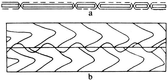 另一种横向有线拼接机,其胶线在单板正反面交织拼接(图1a),可避免板条重叠,拼好的整幅单板强度高,能拼接厚度达4毫米的单板,并能拼接不平整的单板,整机性能优异,特别适合在大型胶合板厂拼接芯板。在发达国家已得到广泛应用。为了适应拼接薄的单板,如表、背板和刨切薄木的需要,已研制出“Z”形胶线拼接机,它也有纵向和横向两种型式。其特点是胶线的运动呈连续的“Z”字形而与拼接缝形成一个波浪形(图1b)。由于这种拼接机的胶线集中粘结在拼接缝的附近,所以拼接强度也较高,而且胶线亦较节省,适宜拼接0.4~2.5毫米厚的单板和刨切薄木。对拼接单板与单板之间的厚度公差较大的单板也能较好的拼接,适应性较强,目前应用较广泛。