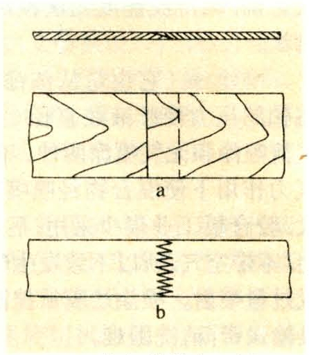 上述拼接机均属把窄条单板(或薄木)拼接成整幅的装置。为了充分利用木材,也可将短木段旋出的单板或短小的薄木加以接长。短单板接长有两种形式:一种为搭接式。如图2a,将单板板端锯成斜面并涂上胶,在单板端接压机上,按顺纹方向拼接起来,剪切成要求的尺寸。另一种为指接式。如图2 b,在单板指接机上进行接长。