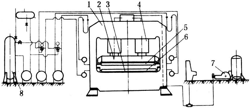 单层热压机一般由机架、上横梁、下横梁、液压缸、热压板、液压系统和加热装置组成(见图)。①机架是承受整个压机载荷的重要部件,必须有足够的强度和刚度。通常机架可分为框架式和立柱式两种。框架式机架是由钢板或型钢制成。它可以是由单片的框架板用连接件和螺栓串接成一个机架,也可以由钢板或型钢焊接成箱框型式。立柱式机架由圆立柱和上、下横梁用螺母固接而成,也可以用钢板焊接成立柱。立柱是立柱式压机的主要支承件和受力件,通常为锻钢件。②上、下横梁是固定热压板和承受压制产品时的单位面积压力的部件。当压机由下而上闭合时,下横梁就必须作成移动式的。如压机由上而下闭合时,上横梁就必须作成移动式的。通常情况下活动横梁受力条件不如固定横梁的受力条件好。所以活动横梁结构尺寸均较固定横梁的大。由于热压板固定在横梁上,所以横梁不仅承受压机的载荷,而且还承受热压板的热影响。③液压缸是单层热压机给制品施压的执行机构,为一种能量转换装置。来自液压系统的液体压力势能由液压缸转换成柱塞的动能并传递给活动横梁,使上、下横梁闭合达到给制品施压的目的。单层热压机如系上压式时,还需另设提升缸,以便对制品压制结束后将活动横梁提升起来。④热压板接受来自加热系统的热量,转而传给制品,是热压机的热量传送装置。同时它又将液压缸通过活动横梁施加的压力均匀分配给制品。热压板传热性能的优劣、加热的均匀性、热压板的热容量、热压板的强度和刚度以及热压板表面的平面度和粗糙度直接影响制品的质量。⑤液压系统是压机产生压力势能的装置,并根据制品压制的工艺要求,完成压机闭合、升压、加压、保压、卸压和开启等动作的控制。一般由电机、油泵、蓄能器、各种液压阀和控制仪表组成。液压系统中的压力介质通常有液压油、机械油、乳化液。对不同的介质应选用不同性能的泵和阀。液压系统的性能不但决定压机的产量、吨位,并直接影响压制品的质量。⑥加热装置是热压板热能的来源。在人造板及其表面加工中使用的加热装置通常由传热介质来决定。当用蒸汽作为传热介质时蒸汽管网和锅炉是加热装置;当用热水作加热介质时,热水循环系统是加热装置;当用电作为加热介质时,电加热系统是加热装置;当用导热油作为加热介质时,导热油加热循环系统是加热装置。而导热油可由蒸汽和电来加热,也可以由专门的导热油加热炉加热。