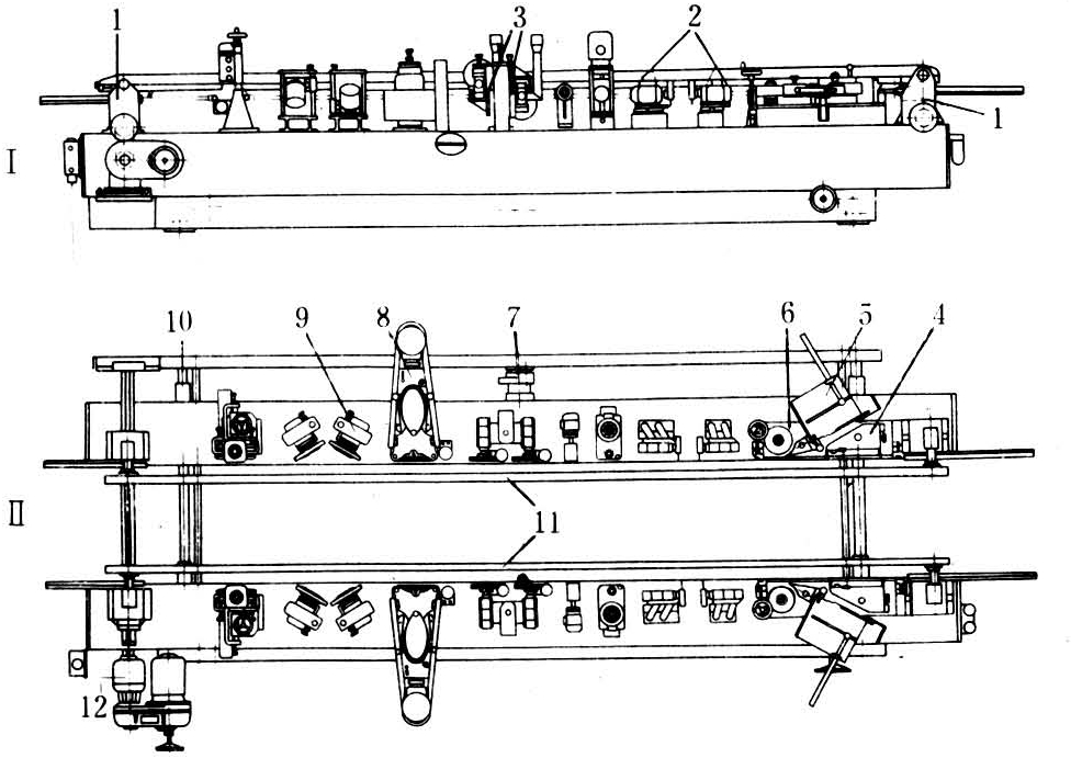 ③自动封边机 由进料机构、封边条输送机构、涂胶机构、压贴辊、铣削装置、砂光机构等部分组成(图2)。这种封边机的封边过程全部实现了机械化和自动化,操作工人只需将机器调整好后把工件送入输送带上,封边条或封边带即自动跟踪工件运动,涂胶机构自动地在工件的边缘上涂上适量的胶,压贴辊将封边条或封边带压贴到工件边缘上,然后由端头和边缘铣削装置自动跟踪工件将封边条在宽度和长度方向多余的部分铣削掉。在封边机的出料端有自动摆动的砂光机构可对木质封边条的边缘进行砂磨,使封贴好的边缘更光洁美观。这种自动封边机可以连续进料,工作效率高,进给速度可达9~45米/分。由于这种封边机生产效率高和结构复杂,通常多用于大型人造板表面加工和板式家具制造企业中。
